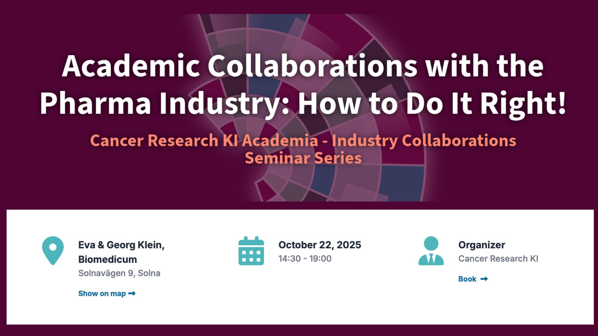 So, how do you build successful collaborations? Join us for an insightful seminar featuring AstraZeneca, Bristol Myers Squibb (BMS), MSD, Roche, LIF (The Swedish Association of the Pharmaceutical Industry), and KI, who will share their experiences, challenges, and practical advice on making collaborations successful.